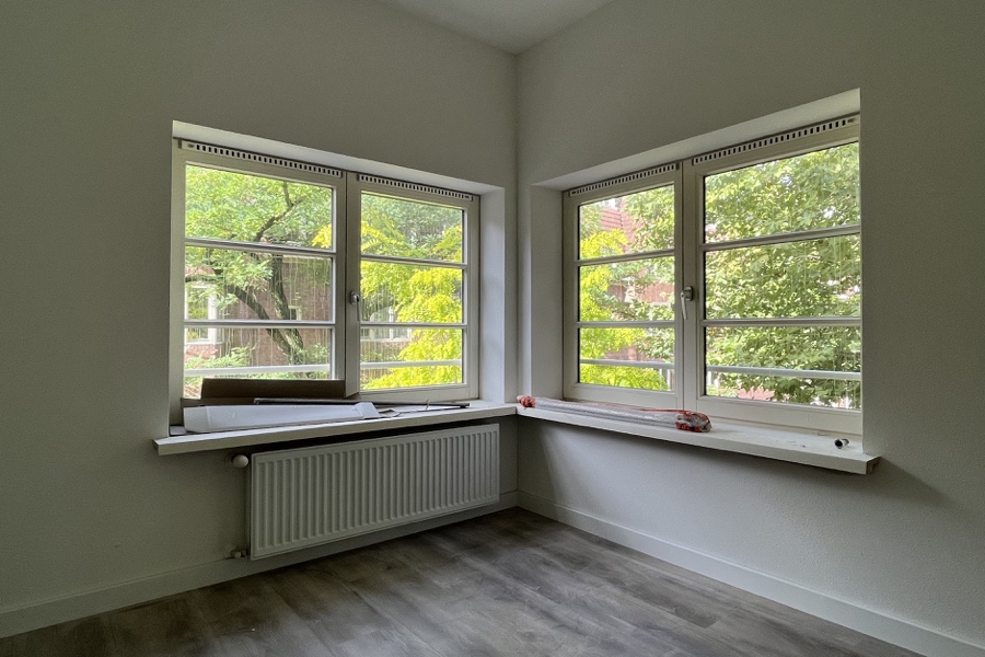 Het uiterlijk van de nieuwe houten kozijnen is voor zover mogelijk gelijk aan de originele kozijnen. De kozijnen zijn vrij vlak en worden weer vanaf binnen tegen de buitenste halve steen geplaatst. Deze ‘Duitse kozijnconstructie’ is conform de oorspronkelijke detaillering. De roedeverdeling is m.b.v. ‘plakroeden’ hersteld. Uit onderzoek is gebleken dat de kozijnen, in ieder geval deels, afgewerkt waren in de kleur okergeel. Omdat de kozijnen van de andere panden in het blok nu afgewerkt zijn in de kleur wit is die kleur ook als basis-kleur gekozen. De bestaande, niet originele, voordeuren zijn vervangen door replica’s. Om onderhoudskosten te beperken zijn de voordeuren en bijbehorende kozijnen dekkend afgewerkt.
