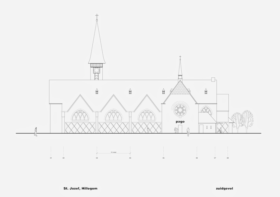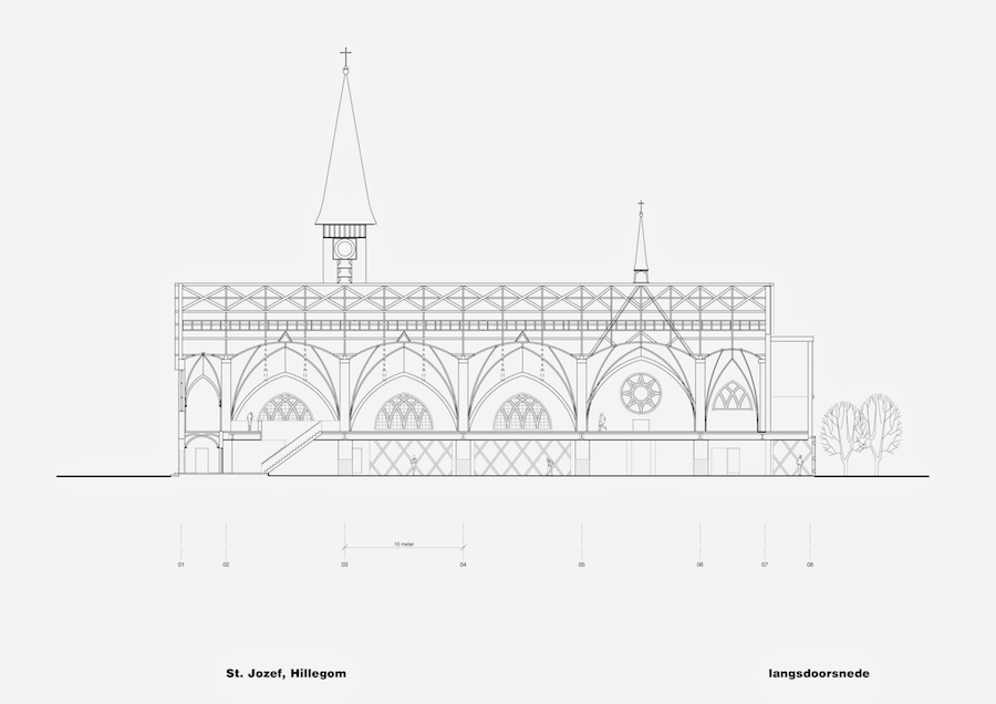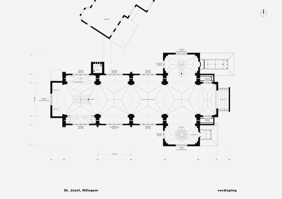 Door het kerkgebouw horizontaal te splitsen worden de verschillende kwaliteiten van de kerk optimaal benut. Er ontstaat een prachtige bovenwereld, waar de specifieke kwaliteit van het gewelf helemaal intact wordt gehouden. Deze ruimte is door zijn hoogte met name geschikt voor intensief en kort gebruik. Zij wordt ontsloten door de hoofdentree van de kerk die ook toegang blijft geven tot de (voormalige doop-)kapel. De ruimte beneden functioneert en manifesteert zich als een hedendaags kantoor met als extra kwaliteit dat op sommige plekken referenties of verbindingen met de kerk zichtbaar zijn. De ruimte wordt via een bestaande deur in de zuidgevel ontsloten. In het verleden aangebrachte uitbouwen worden gesloopt zodat er grote ramen ontstaan, waardoor lichte werkruimten gerealiseerd kunnen worden. De kolommen worden gebruikt om de nieuwe vloer te ondersteunen en zijn ‘omkleed’ als ware het kasten. Tussen de werkplekken bevindt zich een zone waar archiefkasten staan opgesteld.